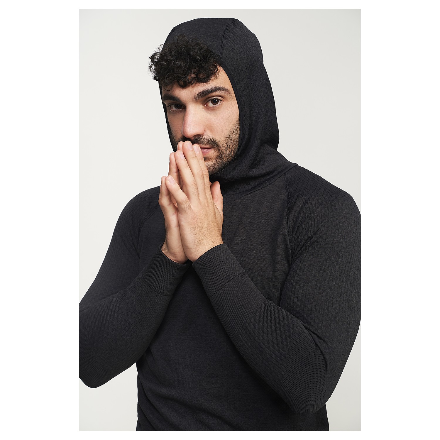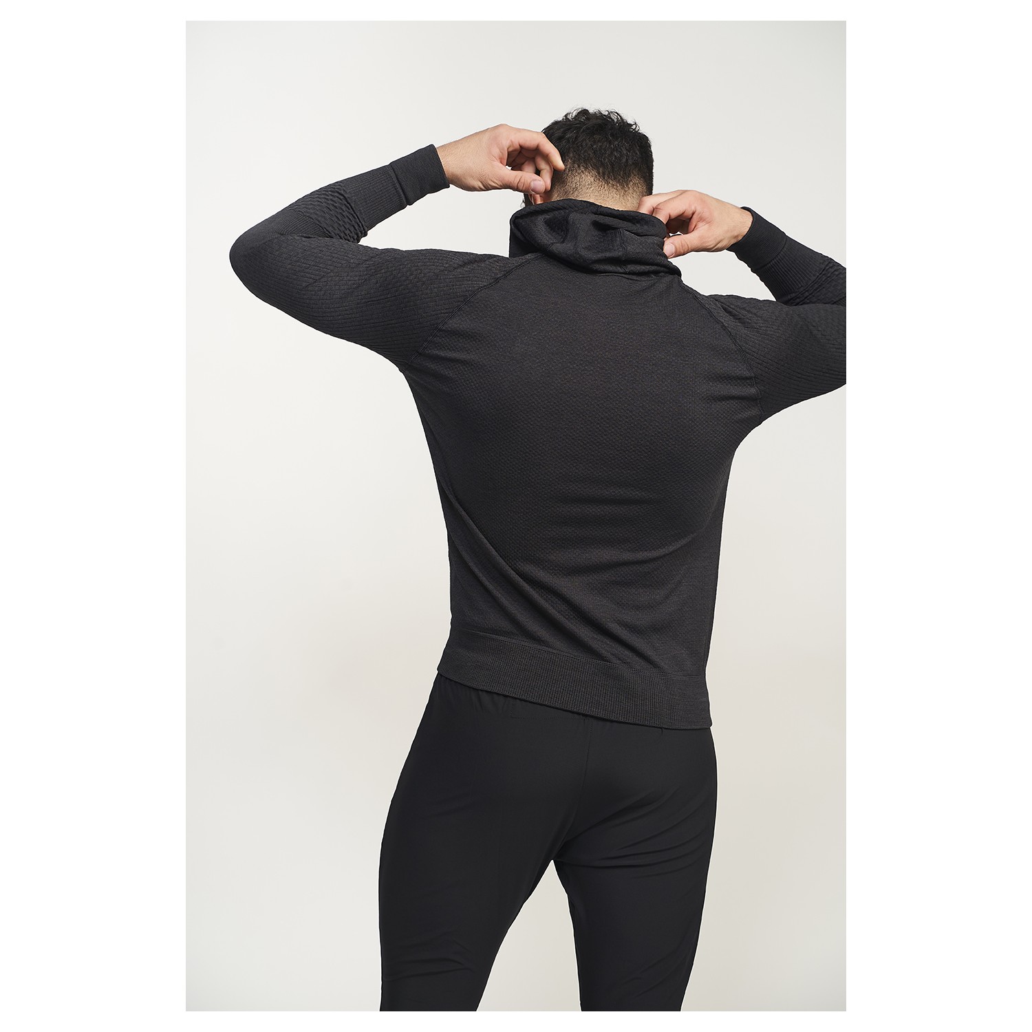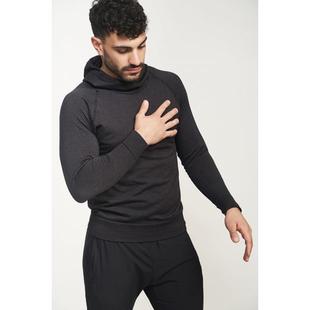 Men's seamless sweatshirt with a hood with brand detail. It offers the basic properties of Climatherm®, with a double layer effect: smart thermoregulation, advanced breathability, antibacterial layer, anti-odor and UPF + 40.